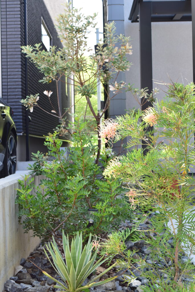 スタイリッシュなデザインの外構にはオージープランツを使用したドライガーデンの植栽デザインが調和してよりカッコイイ外構・エクステリアになります。