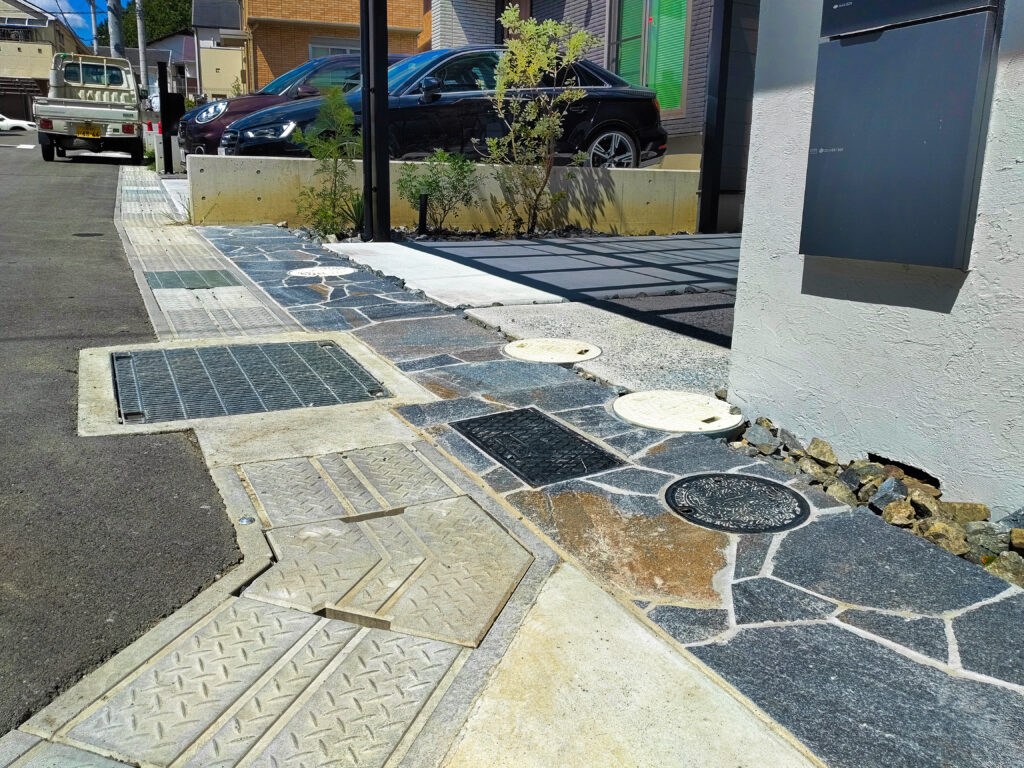 シンプルな外構の中にも、乱形石などでアクセントをつけることで、印象的なエクステリアをつくることができます。