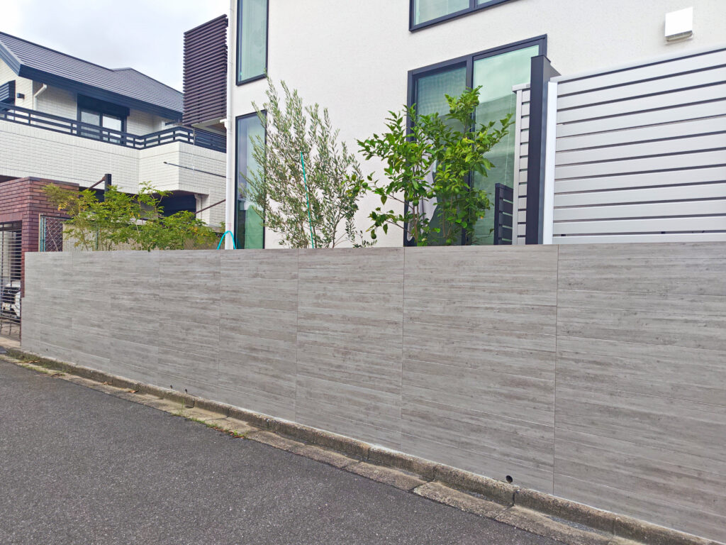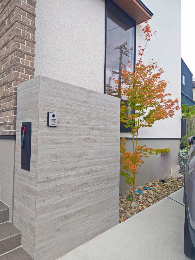 門柱や境界周りの塀の仕上げを杉板調タイルにすることでシンプルかつモダンな雰囲気を演出しています。
